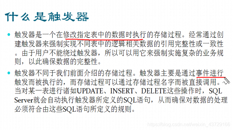 要插入时,insert触发器发挥作用,更新时,update,删除时,delete,但如果要防止,响应或记录更改时,则是DDL触发器发挥作用。