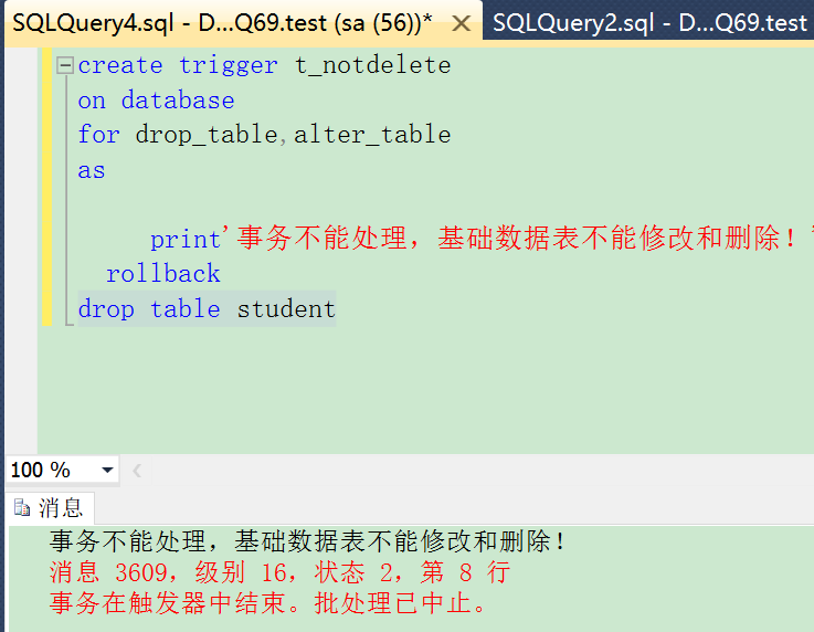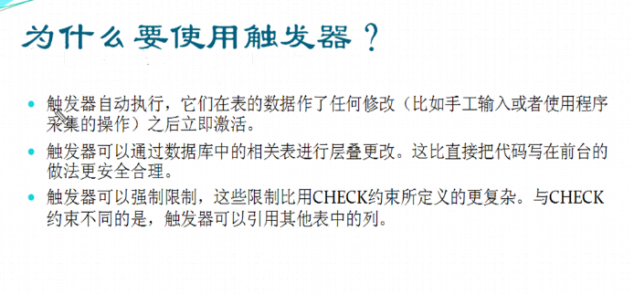 DDL触发器更能体现触发器保持数据完整性和一致性的优点,因为写到会回滚,所以事务在处理完当前事务后,就终止了。