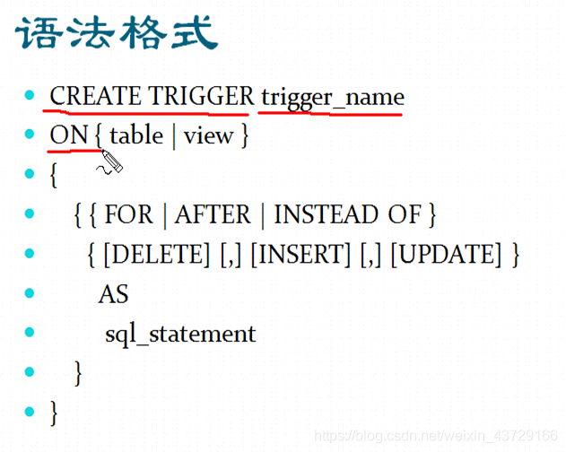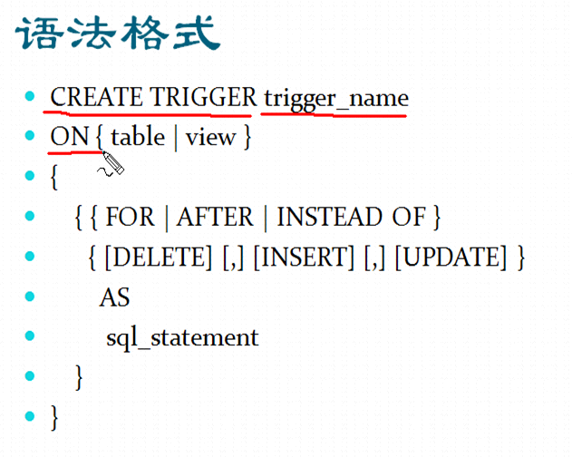 create trigger+触发器名称+on (在某个表格或者视图上)for/after /instead of (这是用来引出触发类型的字句)+delete /insert/update +as +执行的SQL语句。
