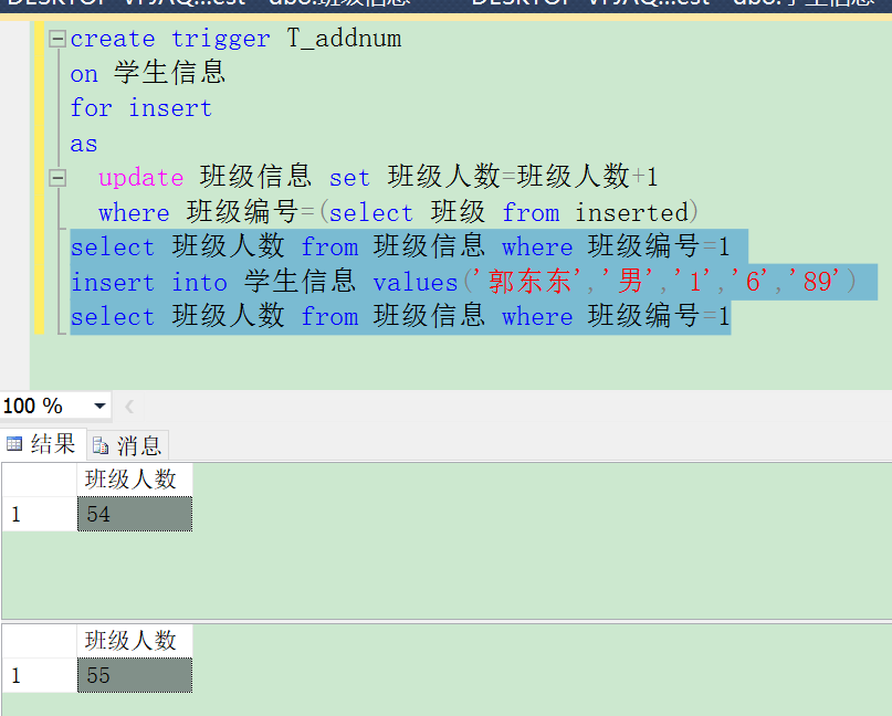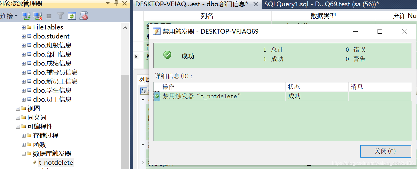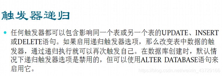 所谓的对触发器的管理,就是 修改,禁用,启用,删除;既可以用系统操作完成,也可以用SQL语句,禁用:alter table student disable trigger t_addnum ,而如果是启用:alter table student enable trigger t_addnum。