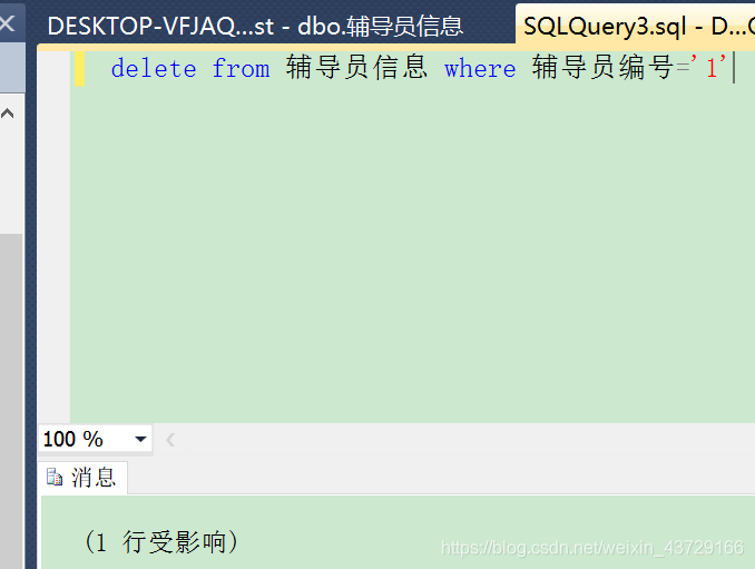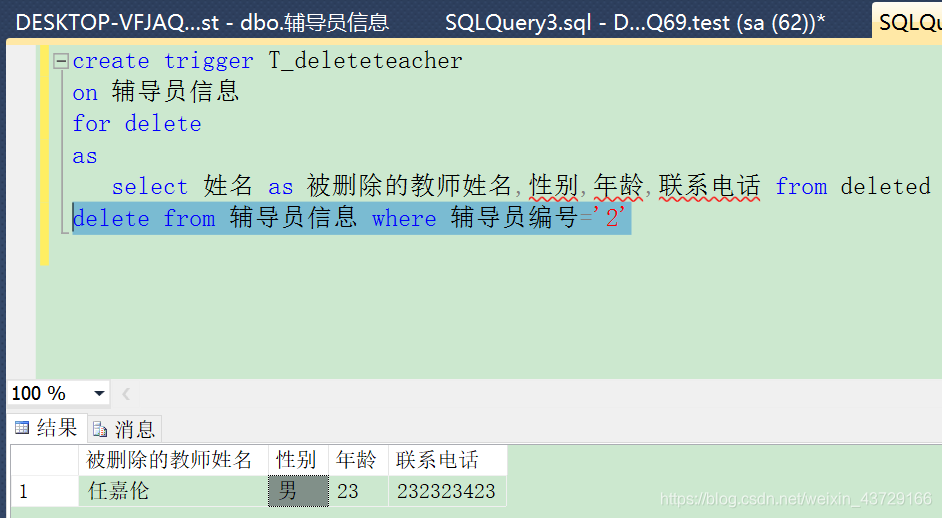 创建第一个insert触发器时,我就在想,我们为什么要使用触发器?虽然上面已经说了,但我并没有真实地感受到,于是,我试了一下没有创建触发器时,单纯地删除表格中一条信息为,效果是第一张图片所示,而创建了触发器后,会发现它能够清晰地显示出被删除的信息。update 触发器也是一样!
