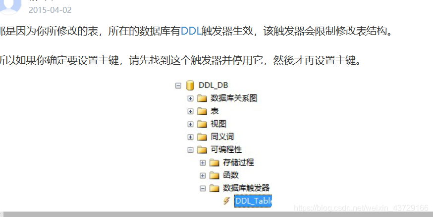 我在敲嵌套触发器的例子时,遇到了不能保存的问题,查百度之后,我发现,是因为我之前创建的一个DDL触发器,为了保持数据一致性与完整性,触发器限制了数据的更改。当我按照图二所示,禁用了此触发器后,便能保存了。
