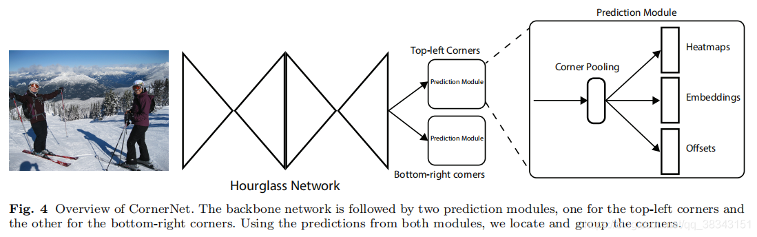 图4提供了CornerNet的概述。 我们使用沙漏网络作为CornerNet的骨干网络。 沙漏网络之后是两个预测模块。 一个模块用于左上角,而另一个模块用于右下角。 每个模块都有自己的corner pooling模块,在预测热图、嵌入和偏移之前,池化来自沙漏网络的特征。 与许多其他物体探测器不同,我们不使用不同尺度的特征来检测不同大小的物体。 我们只将两个模块应用于沙漏网络的输出