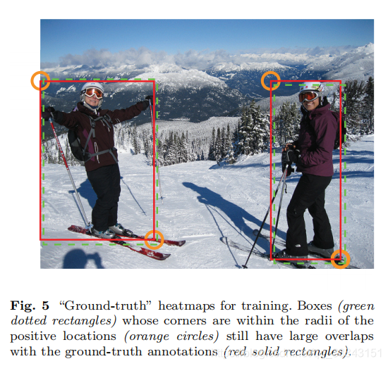 对于每个角点,有一个ground-truth正位置,其他所有的位置都是负值。 在训练期间,我们没有同等地惩罚负位置,而是减少对正位置半径内的负位置给予的惩罚。这是因为如果一对假角点检测器靠近它们各自的ground-truth位置,它仍然可以产生一个与ground-truth充分重叠的边界框(图5)。我们通过确保半径内的一对点生成的边界框与ground-truth的IoU ≥ t(我们在所有实验中将t设置为0.7)来确定物体的大小,从而确定半径。惩罚权重是通过未归一化2D高斯分布