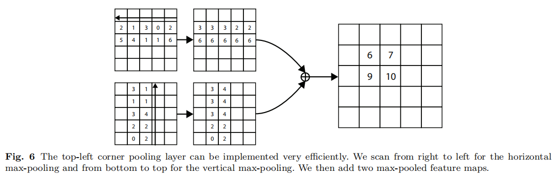 这个是文章为了更好的预测角点位置提出的一个新的pooling方法。拿左上角点来说,为了更好的判断featuremap中的某一点是左上角点,我们从右到左扫描水平最大池化,从下到上扫描垂直最大池化(可以认为是左上角点的响应值)。对于一张大小为H×W的特征图,对于特征图上的点(i,j),corner pooling的计算方式为