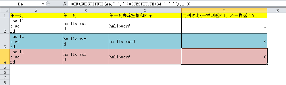 =IF(SUBSTITUTE(SUBSTITUTE(A2," ",""),CHAR(10),"")=SUBSTITUTE(SUBSTITUTE(B2," ",""),CHAR(10),""),1,0)