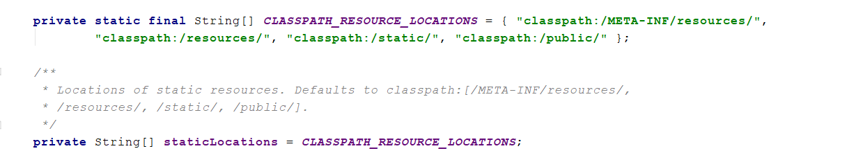 2.spring.resources.static-locations: 这个就是配置上面讲的静态资源配置目录,在SpringBoot启动的时候会去应用它配置目录,默认值是:classpath:/static,classpath:/public,classpath:/resources,classpath:/META-INF/resources,servlet context:/,可参见ResourceProperties类代码,如下: