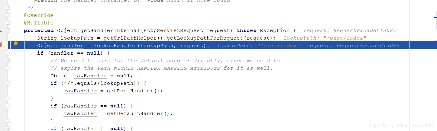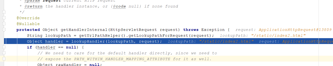 但是实际上prefix是在url匹配到Handle之后才给Controller方法的返回值加上的。查看AbstractUrlHandleMapping,可以看到lookHandle方法被调用了两次,如下图所示