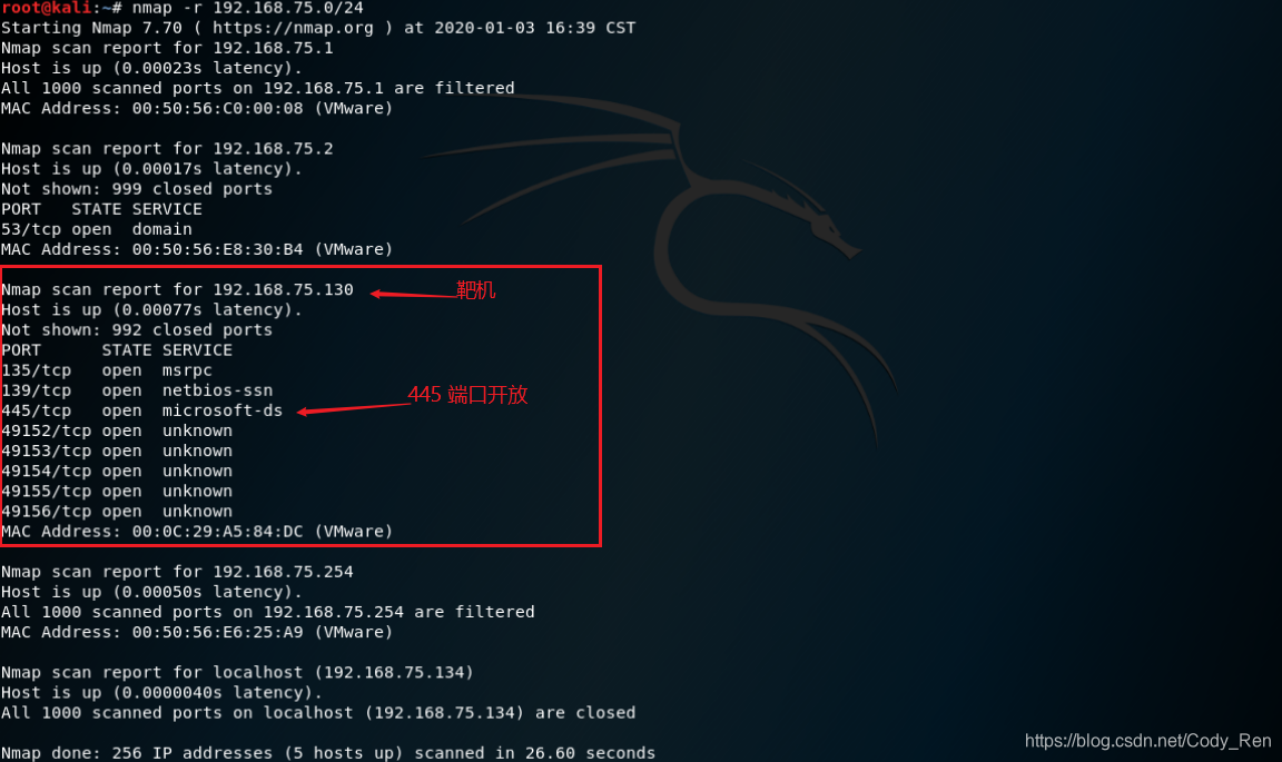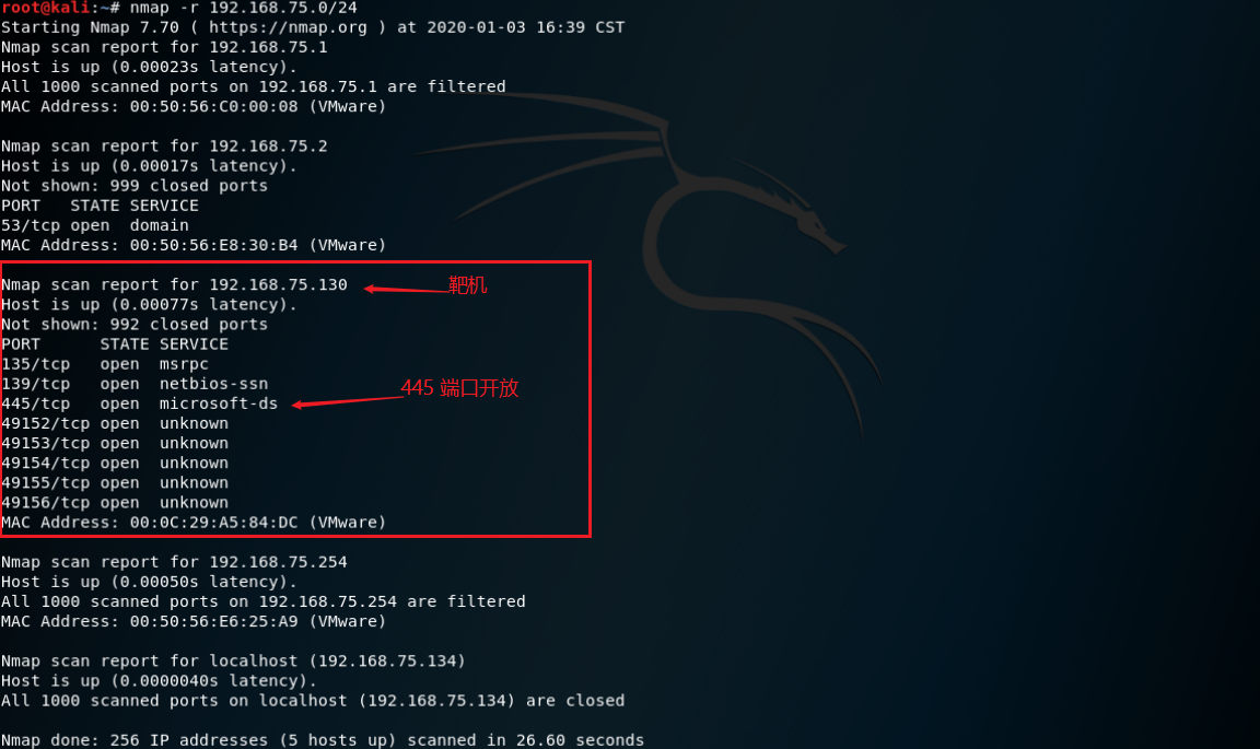 1、用 nmap 扫描本网段中存活的主机 nmap -r 192.168.75.0/24 ,可以看到探测到了靶机,445端口开放,永恒之蓝利用的就是445端口的 SMB 服务(注意把防火墙关闭,否则ping不通)。