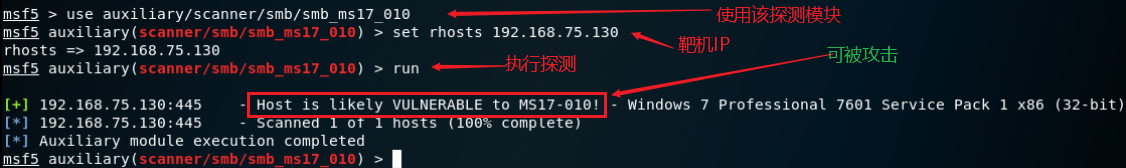 3、使用 ms17-010 的扫描模块,对靶机进行扫描,提示 Host is likely VULNERABLE to MS17-010! 说明该IP可以被攻击。