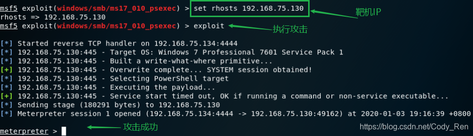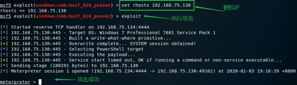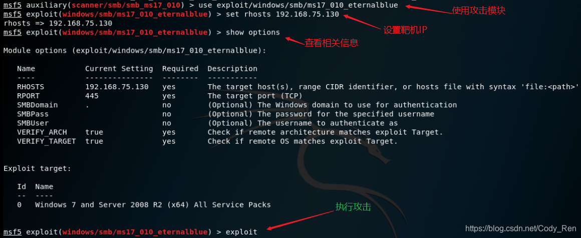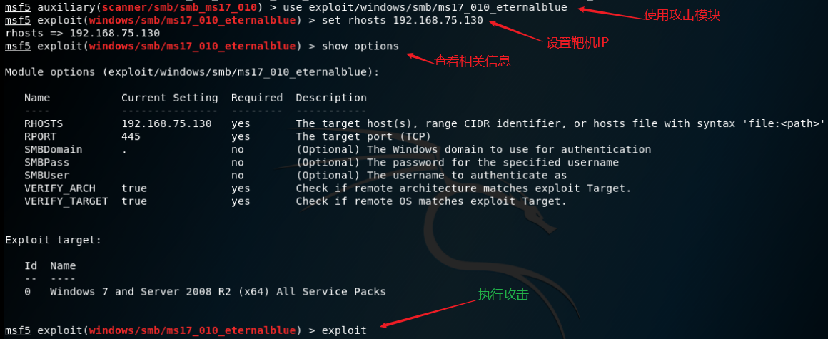 4、使用 ms17-010 的攻击模块,对靶机进行攻击