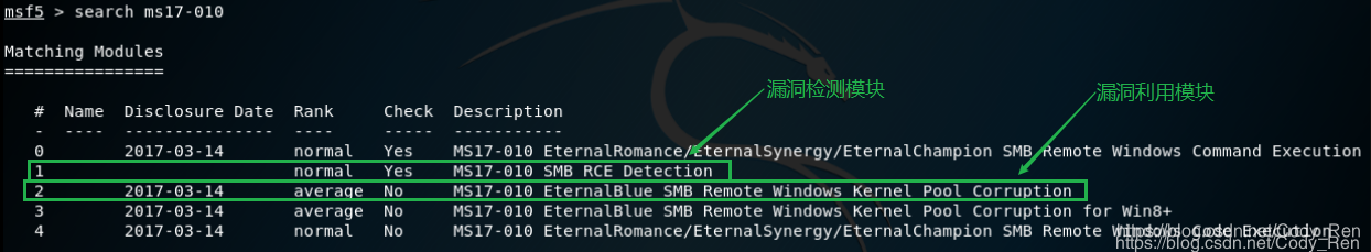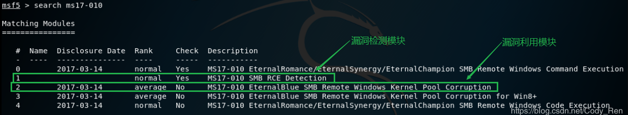 搜索 ms17-010 的 exploit,输入 search ms17-010 ,Name栏应该显示对应 payload 的名称。