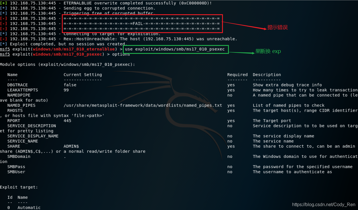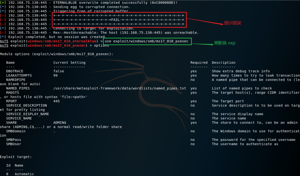 果断换 exp ,use exploit/windows/smb/ms17_010_psexec