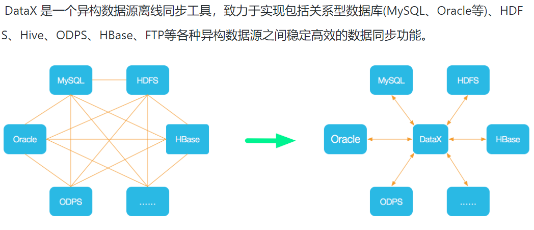 为了解决异构数据源同步问题,DataX将复杂的网状的同步链路变成了星型数据链路,DataX作为中间传输载体负责连接各种数据源。当需要接入一个新的数据源的时候,只需要将此数据源对接到DataX,便能跟已有的数据源做到无缝数据同步。
