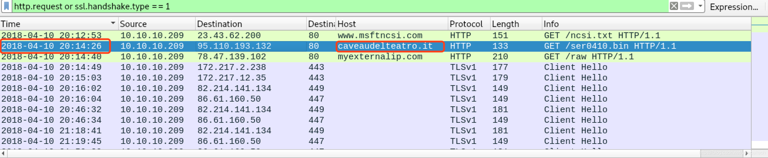 可以看到书2018-04-10的晚上8点14分通过http请求,从caveaudeleteatro.it获取恶意文件感染的