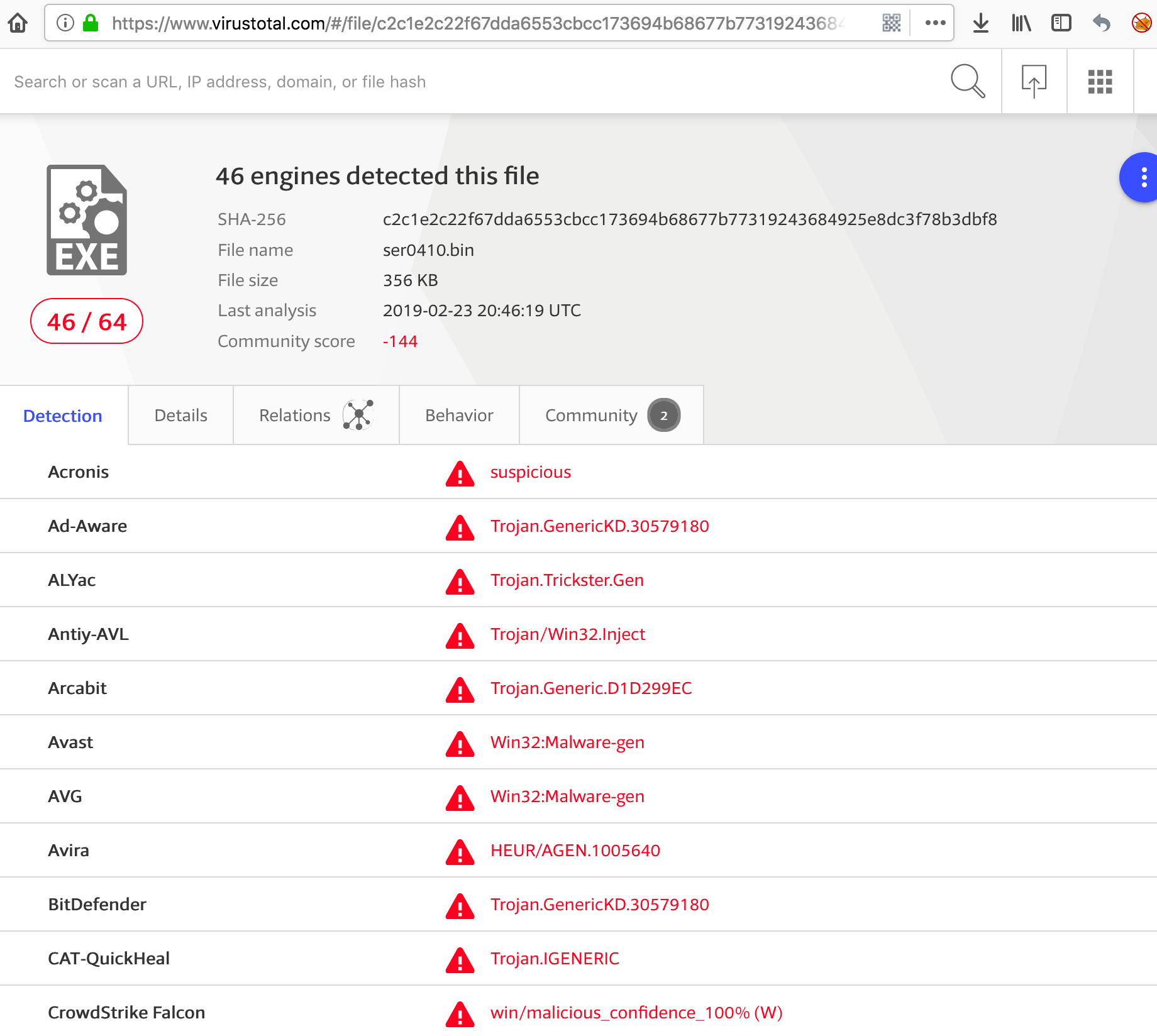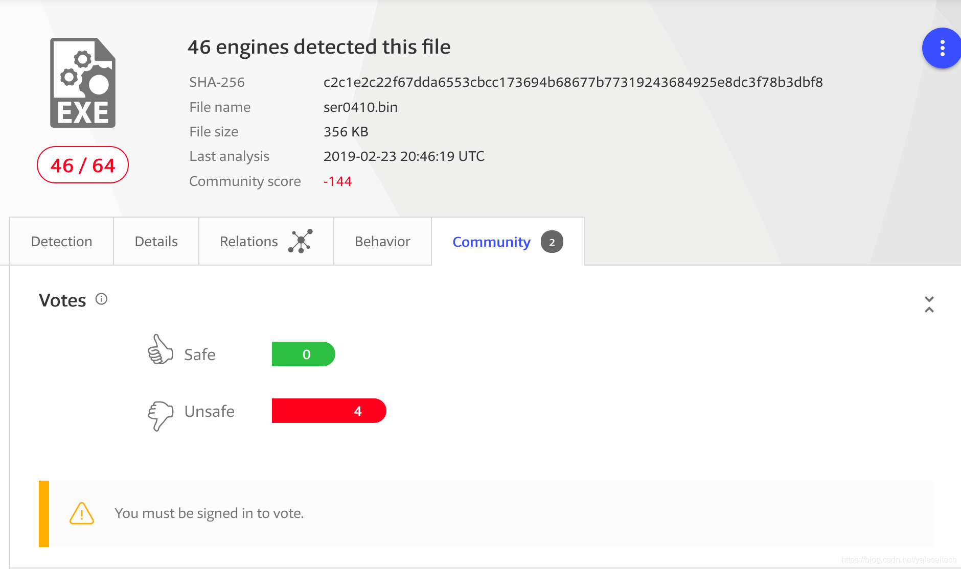然后我们可以通过计算它的sha256哈希去virustotal看看这是否是可疑文件