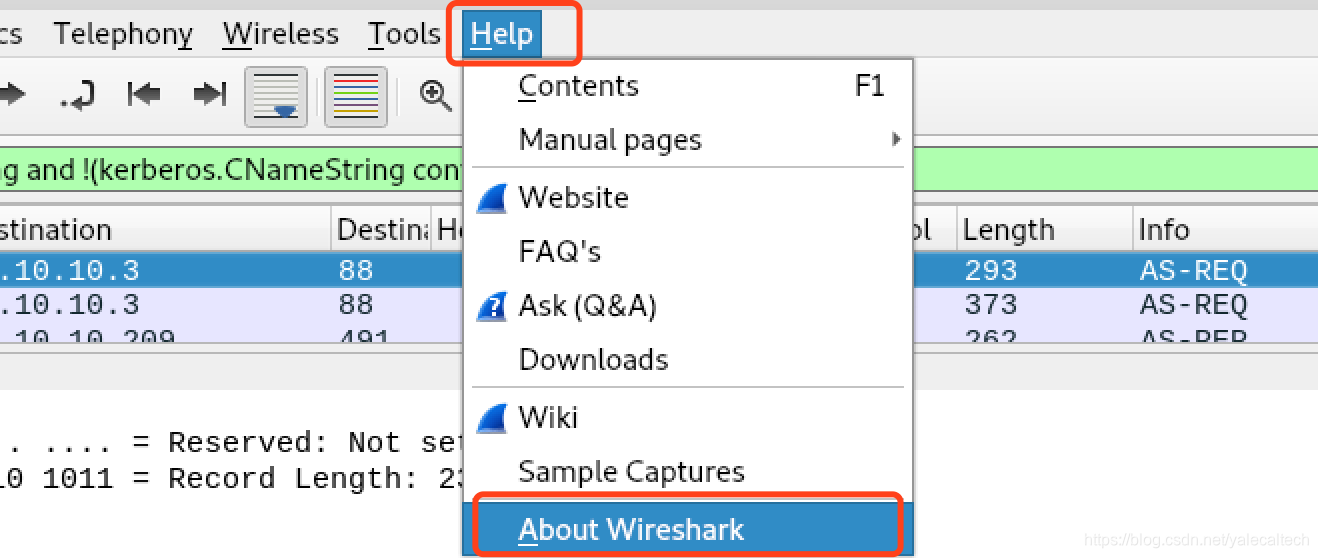 要查看自己的wireshark的版本号可以help->wireshark