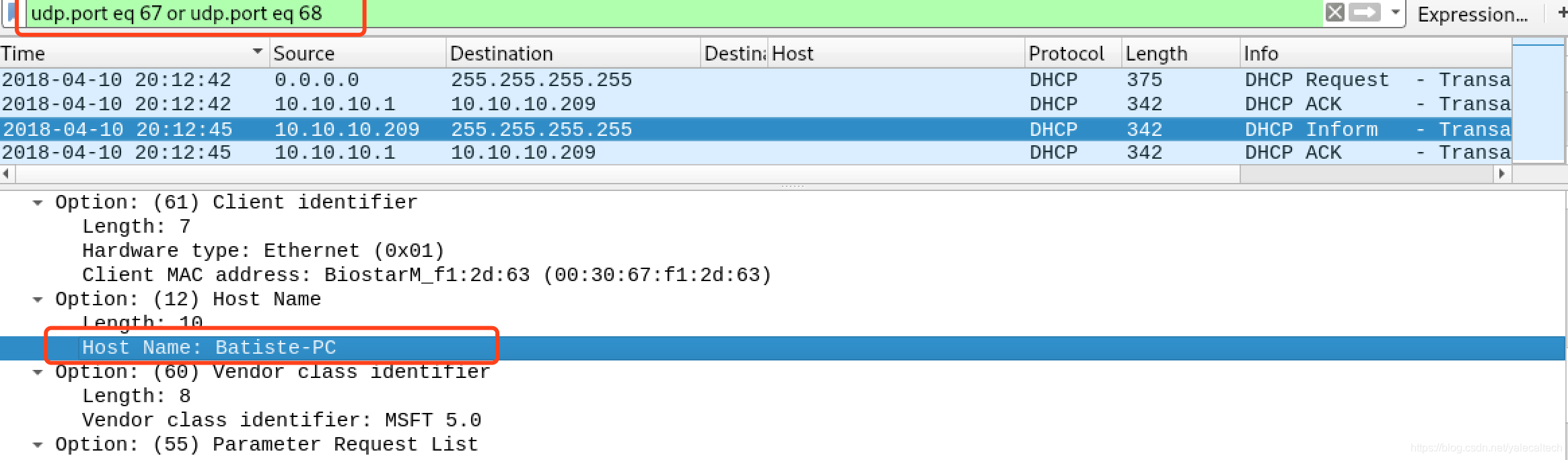这里注意,dhcp前身是bootp,直接在wireshark中使用dhcp过滤可能无效,我们使用bootp就行了