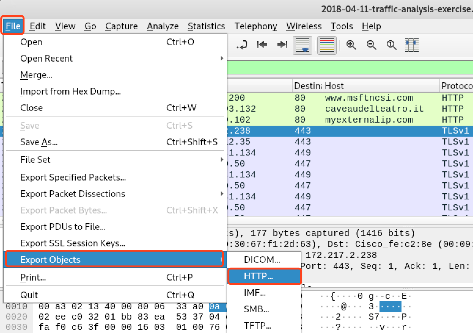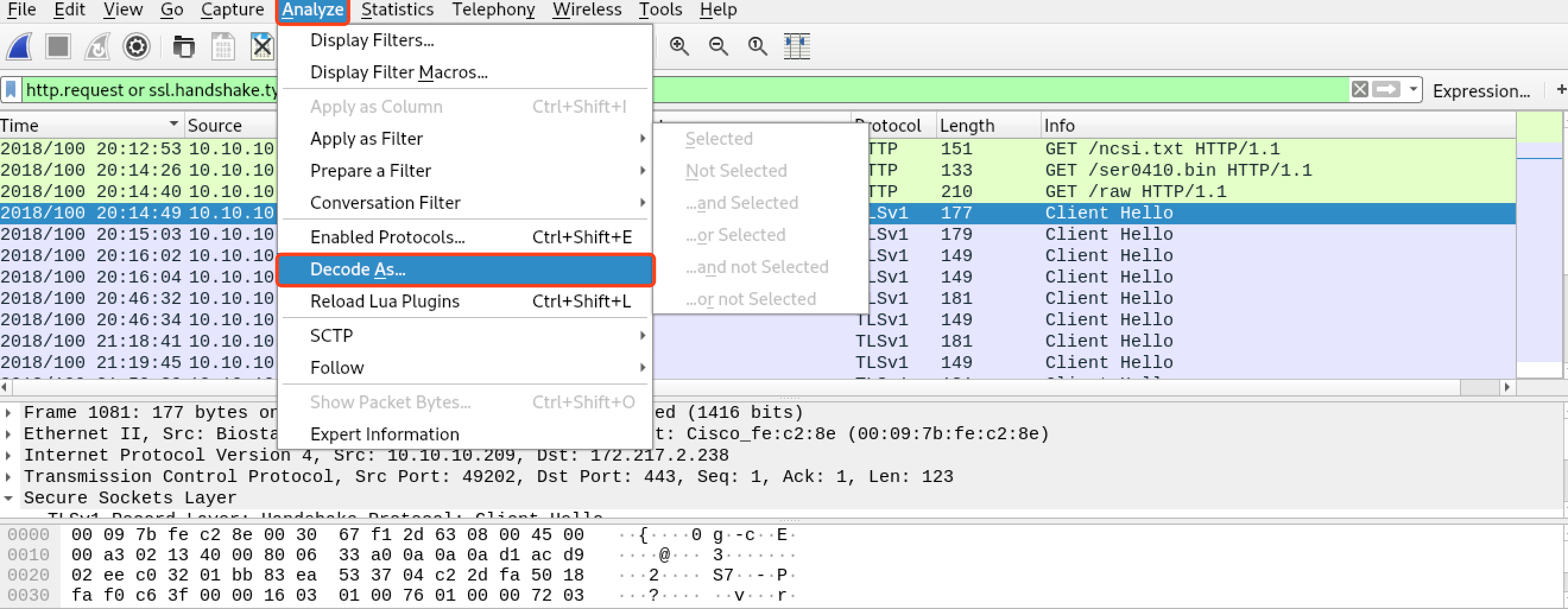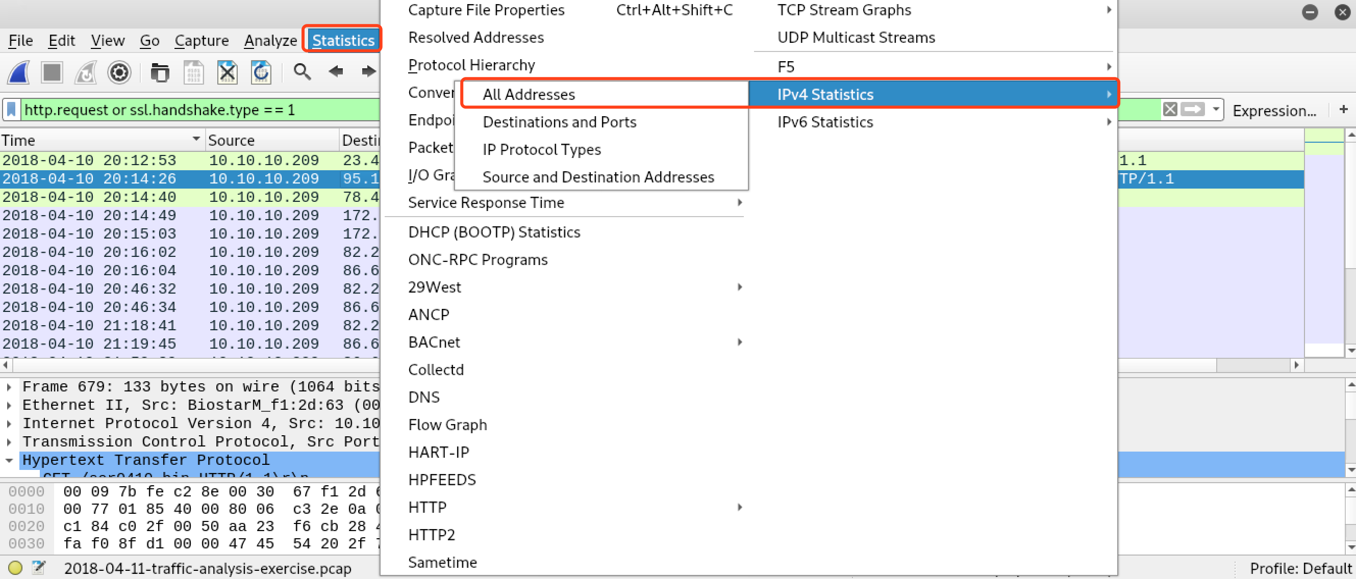 前面的分析经验告诉我们,首先看http,https的流量,基本大多数的攻击流程都是通过网页挂马或者钓鱼之类的活动诱使受害者主机有意或无意地下载恶意软件,然后在主机上打开其他端口通信或者伪装为正常浏览通信,或者通过dhcp,icmp等隧道通信。不论怎样,最开始的步骤 一定是和http,https有关的,所以先过滤出对应的流量。