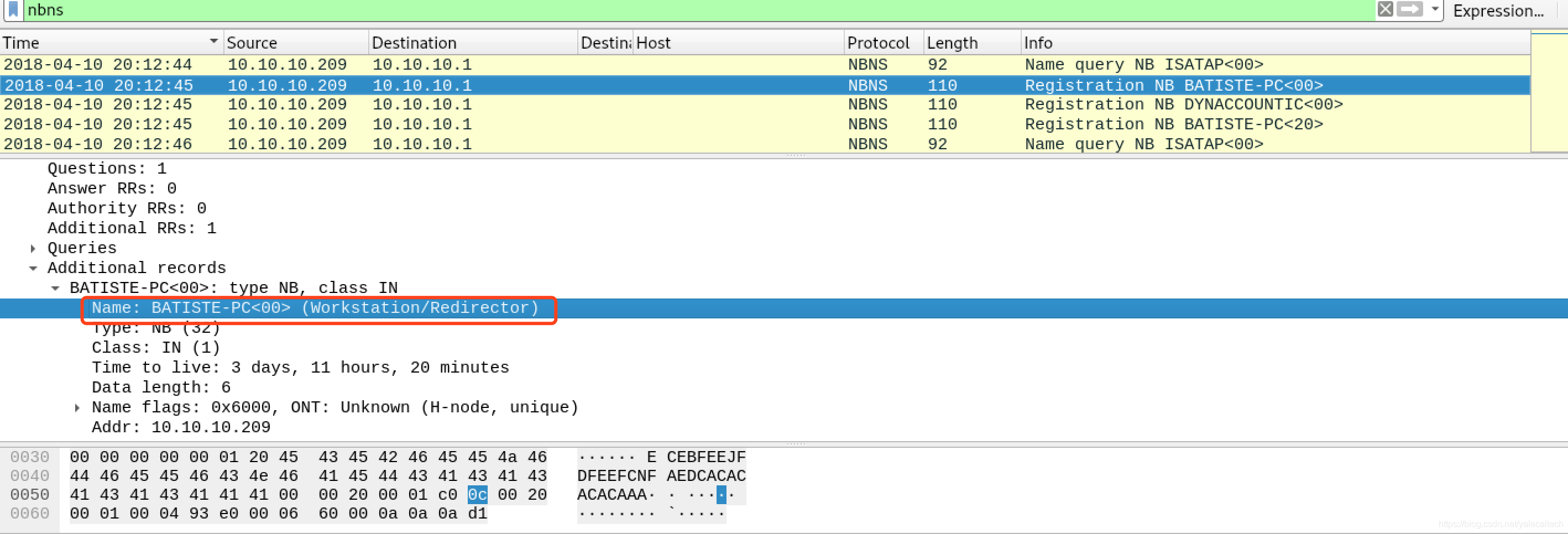 其实我们注意到数据包中还有nbns流量,所以可以尝试使用nbns来获取hostname,直接使用nbns过滤即可