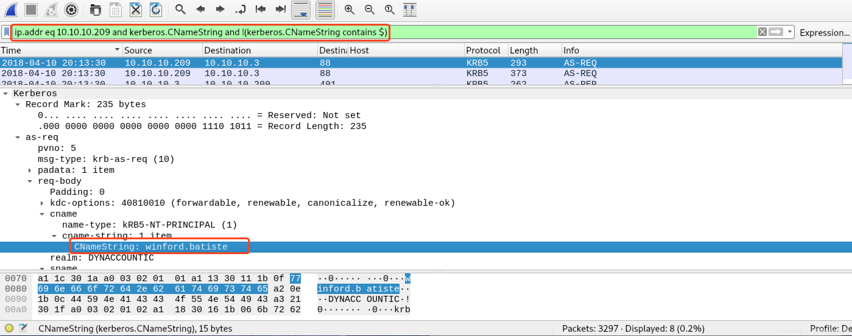 ip.addr eq 10.10.10.209 and Kerberos.cname_element and kerberos.KernerosString and !(kerberos.KerberosString contains $)