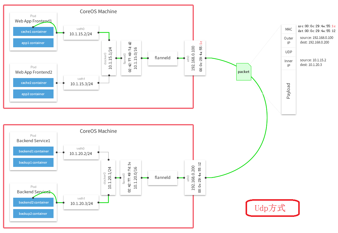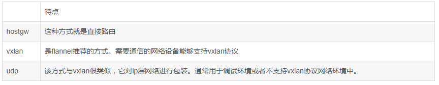 目前flannel有多种backend管理网络,常用的有三种:hostgw,udp,vxlan,三者差异如下: