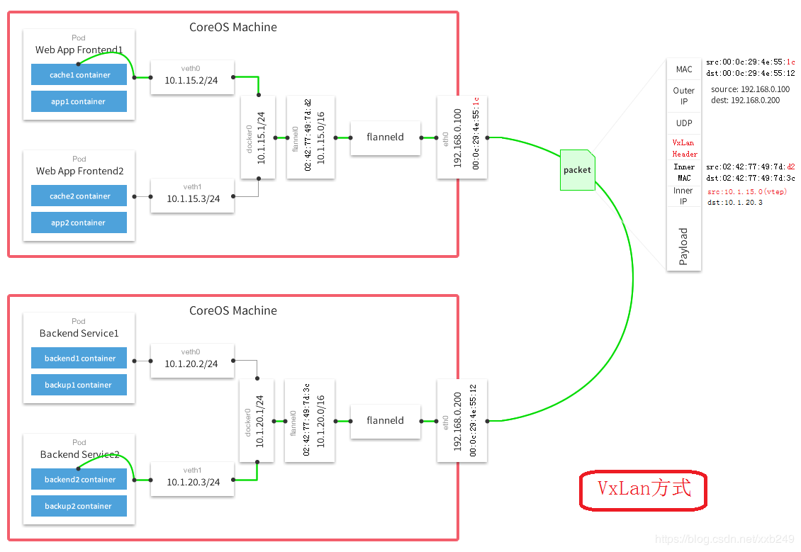 通过上面两张图可知,这两种方式区别:vxlan方式下面多出了:vxlan header和内部mac地址(Vtep的地址)并且内部源ip为vtep所在ip地址。对于vxlan说明,这里有一篇比较高质量文章,大家可参考《vxlan 协议原理简介》。