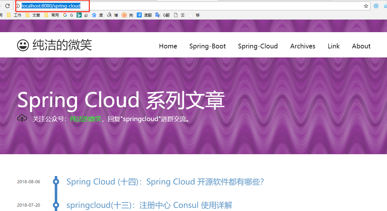 上面这段配置的意思是,配置了一个 id 为 neo_route 的路由规则,当访问地址 http://localhost:8080/spring-cloud时会自动转发到地址:http://www.ityouknow.com/spring-cloud。配置完成启动项目即可在浏览器访问进行测试,当我们访问地址http://localhost:8080/spring-cloud 时会展示页面展示如下: