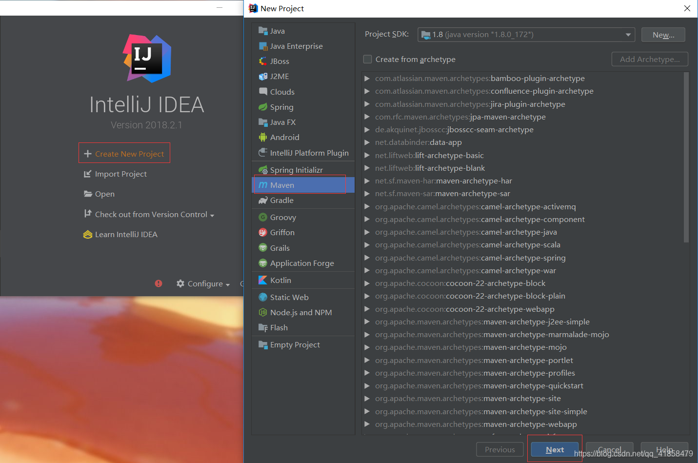 打开idea-->Create New Project -->选择Maven -->单击next—>输入姓名名称-->一直下一步。具体如下图: