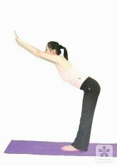 第七步:慢慢伸直身体,略微低头同时将双手交握放于身体前面