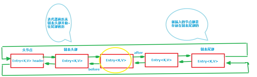 第一张图为LinkedHashMap整体结构图,第二张图专门把循环双向链表抽取出来,直观一点,注意该循环双向链表的头部存放的是最久访问的节点或最先插入的节点,尾部为最近访问的或最近插入的节点,迭代器遍历方向是从链表的头部开始到链表尾部结束,在链表尾部有一个空的header节点,该节点不存放key-value内容,为LinkedHashMap类的成员属性,循环双向链表的入口。