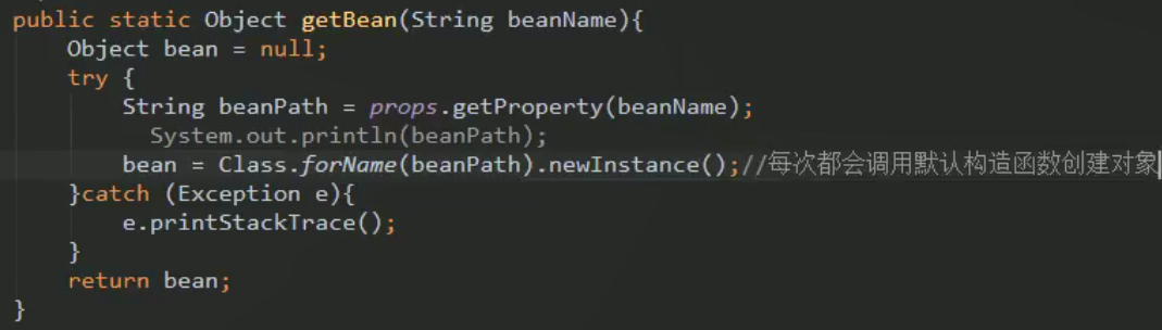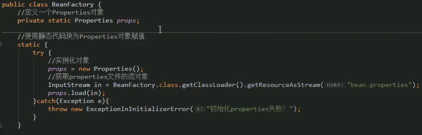 public class BeanFactory { //定义一个Properties对象 private static Properties props; //定义一个Map,用于存放我们要创建的对象。我们把它称之为容器 private static Map<String,Object> beans; //使用静态代码块为Properties对象赋值 static { try { //实例化对象 props = new Properties(); //获取properties文件的流对象 InputStream in = BeanFactory.class.getClassLoader().getResourceAsStream("bean.properties"); props.load(in); //实例化容器 beans = new HashMap<String,Object>(); //取出配置文件中所有的Key Enumeration keys = props.keys(); //遍历枚举 while (keys.hasMoreElements()){ //取出每个Key String key = keys.nextElement().toString(); //根据key获取value String beanPath = props.getProperty(key); //反射创建对象 Object value = Class.forName(beanPath).newInstance(); //把key和value存入容器中 beans.put(key,value); } }catch(Exception e){ throw new ExceptionInInitializerError("初始化properties失败!"); } } /** * 根据bean的名称获取对象 * @param beanName * @return */ public static Object getBean(String beanName){ return beans.get(beanName); }