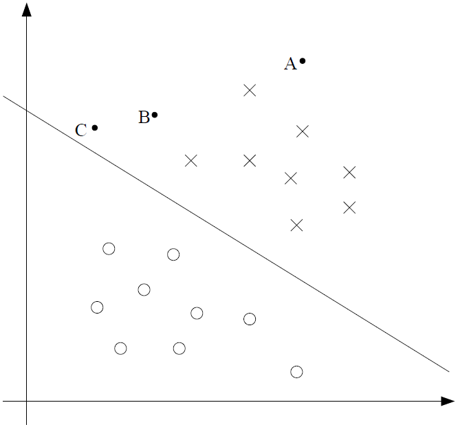考虑上面3个点 A 、B和C。从图中我们可以确定A是×类别的,然而C我们是不太确定的,B还算能够确定。logistic 回归强调所有的点尽可能的远离中间那条线即可,由此可能造成如上所示,点C可能属于o类别也可能属于×类别,所以我们这里希望找到一个分隔线,使其所有的分类结果有足够的 确定性,这就是logistic 回归和支持向量机的不同点。