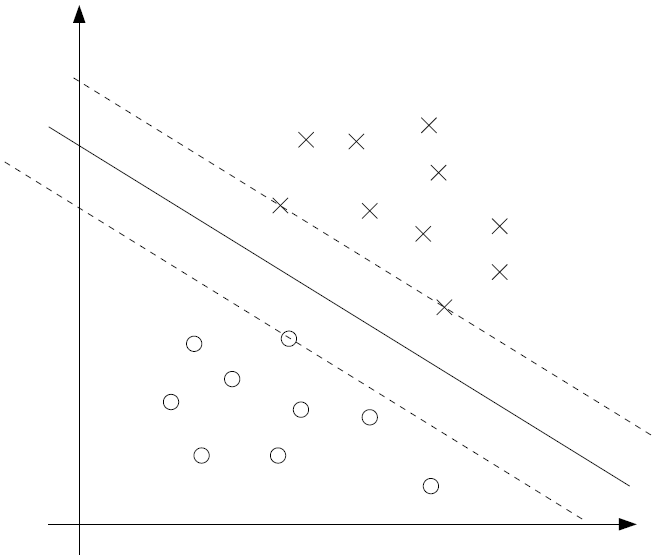 你有一些训练样本和一个分隔超平面,根据上面的假设αi>0(换个说法是αi=0)就一定会有函数间隔为1的样本,即上图中虚线部分,这些里超平面最近的样本。在这个用图展示的例子中,所有离超平面较远样本的函数间隔都大于1。