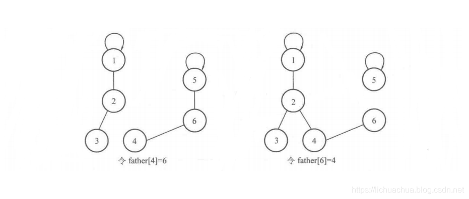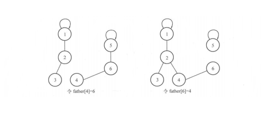 这里需要注意的是,很多初学者会直接把其中一个元素的父亲设为另一个元素,即直接令 father[a]=b来进行合并,这并不能实现将集合合并的效果。例如,将上面例子中的 father[4]设为6,或是把 father[6]设为4,就不能实现集合合并的效果,如下图所示。