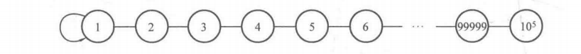 上面讲解的并查集查找函数是没有经过优化的,在极端情况下效率较低。现在来考虑一种情况,即题目给出的元素数量很多并且形成一条链,那么这个查找函数的效率就会非常低如下图所示,总共有10^5个元素形成一条链。那么假设要进行10^5次査询,且每次查询都查询最后面的结点的根结点,那么每次都要花费10^5的计算量查找,这显然无法承受。