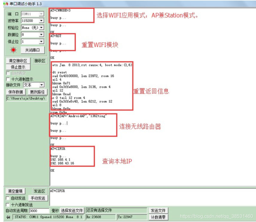 AT+CWJAP="your ssid","password" //连接无线路由器
