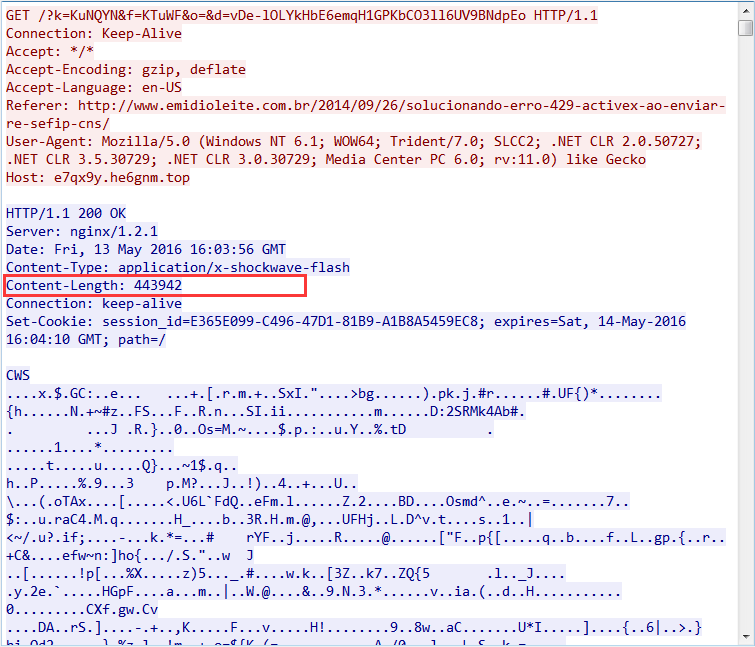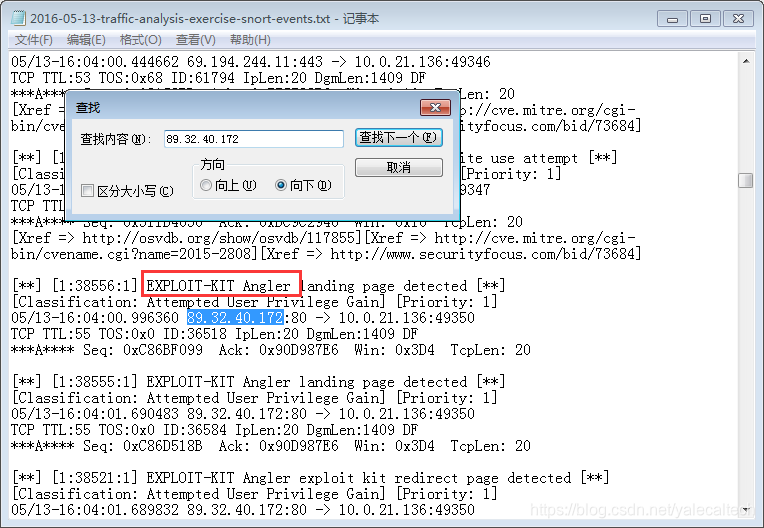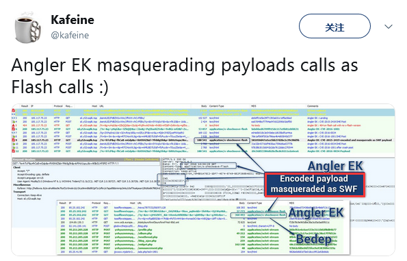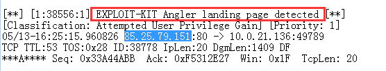 可以看到snort检测到是属于Angler exploit-kit发起的攻击,后面还提示是landing page,那么一定会传递载荷