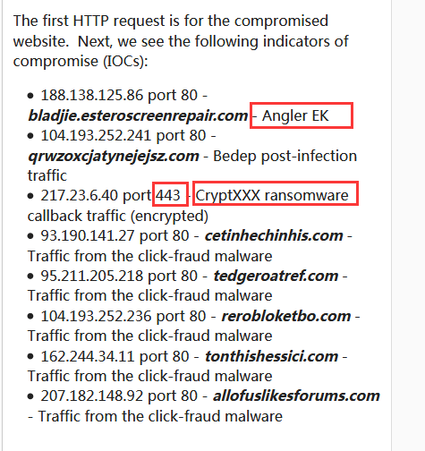 用户受到了三次感染,第一次是来自malware spam的Locky ransomware,第二次是Angler EK的文件(由分析文章推知是伪装的swf文件),第三次是Angler EK的CryptXXX ransomware。