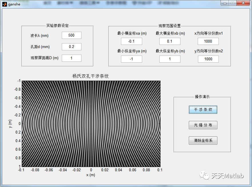 本文采用gui演示杨氏双缝干涉实验,可以调整参数,实验原理详参光学教程。