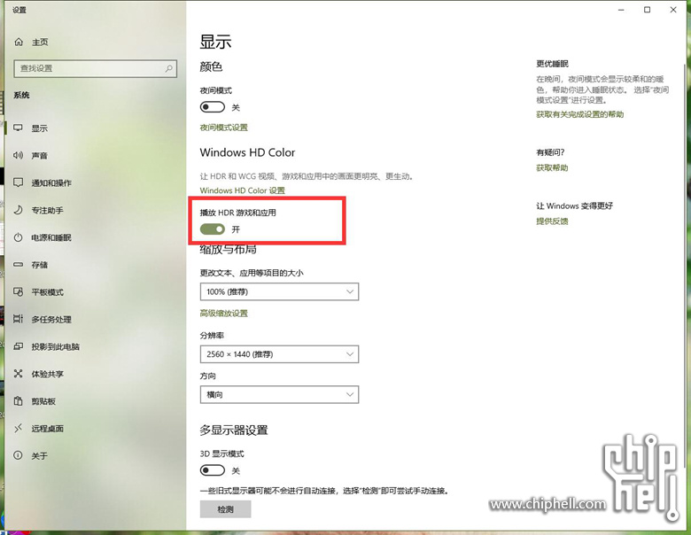 如果没有这个选项,请检查是否连接的高版本HDMI或者DP,然后检查显卡驱动是否升级到最新版或者显卡设置是否开启HDR