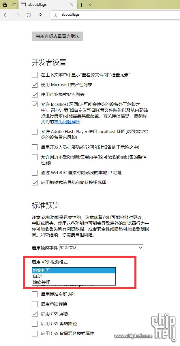microsoft Edge(感谢ts02147823提供的方法):需要手动开启VP9,在地址栏输入about:flags,然后VP9选项改为“始终打开”