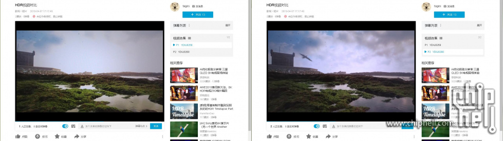 最后附上youtube的样片对比,因为屏摄,有波纹,还有可能过曝。实际两者差别和屏摄还是有很大差距,至于真实HDR和不开HDR差距到哪种程度呢。我女朋友观看HDR电影对比原话是:“这简直是两个电影”