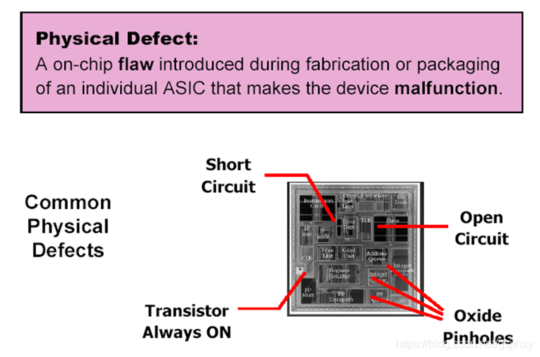 - 需要通过对芯片内部制造缺陷引起的电路故障建立逻辑上的模型,从而通过测量电路在输入输出管脚上行为,来判断芯片内部是否存在制造缺陷Physical Defects(制造缺陷) à Fault Model(故障模型)