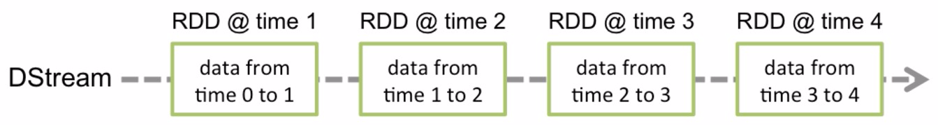 Spark Streaming 最主要的抽象是离散化数据流(DStream),DStream 表示连续不断的数据流。在内部实现上,Spark Streaming 的输入数据按照时间片分成一段一段,每一段数据转换为 Spark 中的 RDD,并且对 DStream 的操作都最终被转变为相应的 RDD 操作。如下图所示: