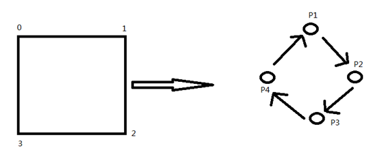 如下图,四个点的坐标信息保存在一个双向循环链表的结构中,这样,我们只需要知道一个点就可以按照我们预定的方向拿到剩下的所有点了。