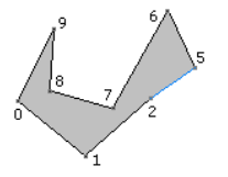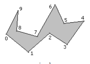定义上面的多边形点集合P:(0~9),并使用双向链表将这些点保存起来。接着,根据“耳朵”的定义,找出点集合P中所有的“耳”点(即符合条件的凸顶点),即初始状态下的“耳朵”集合E,所有的凸顶点(Convex Vertices)集合C,所有的凹顶点(即该点的两条边形成的内角大于180度,称Reflex Vertices)R。得到初始状态 E={3,4,6,9},C = {0,1,3,4,6,9},R = {2,5,7,8}。