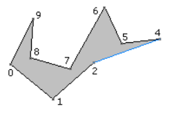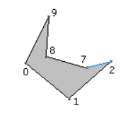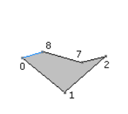 移除耳点9,此时顶点0和8变成了耳点被添加到E中:E = {0,2,8},凹顶点R中,顶点8已不是凹顶点,故R = {7},凸顶点 C ={0,1,2,8}。由此产生第五个三角形 T4 = {8,9,0}。如下图所示: