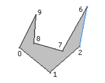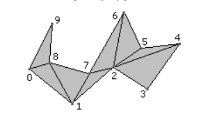 移除耳点6,此时一直是凹顶点的2成为了耳点被添加到E中,E = {9,2},凹顶点集合R不变,凸顶点集合C = {0,1,2,9},此过程产生第四个三角形:T3={2,6,7}。如图所示: