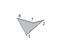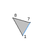 移除耳点2,剩下三个点,自然到了三角化的最小单元,作为迭代结束条件,产生第七个三角形并记录下来: T6 = {1,2,7},加上最后剩下的三角形作为第八个三角形 T7 = {1,7,8},并退出迭代,整个三角化过程完成;同时,R为空,C={1,7,8}。如下图所示:
